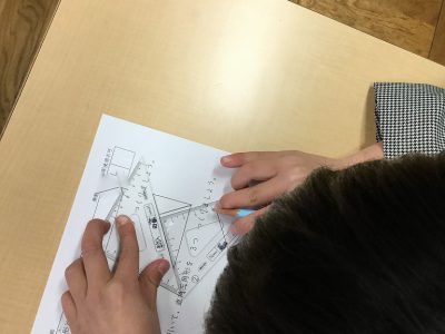 「どの辺に定規をあてればよいのか?」をめぐらせながら、2枚の三角定規をくるくる回し、自分の考えにたどり着いています。