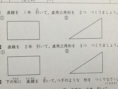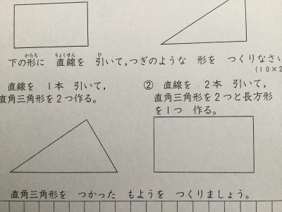 一つの形から、指定された数の直角三角形や長方形をかき分ける学習です。