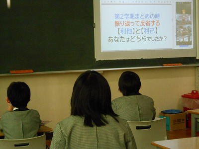場面に応じて、それを考えるという事が「心をつかうこと」というお話を受けて、4年生もどんな事ができるかを教室で考えました。4年生は、「利己」で動いていた事が多かったようです。弱い自分に負けないために、たくさん頭と心をつかう事が大切……と知りました。