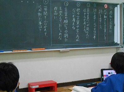 詩には、「たとえ表現」や「語順を変える」などのいろいろな工夫がありました。自分達も調子やリズムに気をつけながら、1年間の振り返りをテーマに詩を作りました。