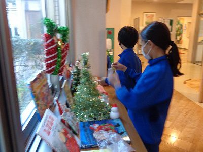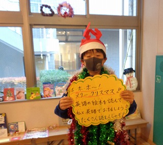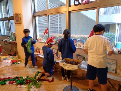 今日の活動は、小学生新聞のボード案内書き・英語ネームプレートの点検・卒業アルバム用の写真撮影の他、職員室前の「クリスマス英語絵本展示と飾り掲示」をしました。