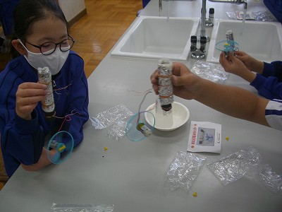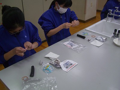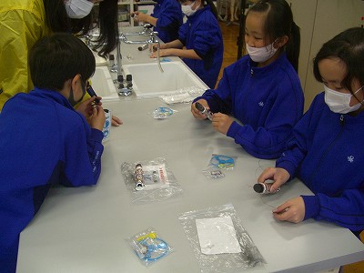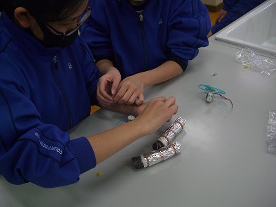 今日の理科は、特別出張授業です。「関西電気保安協会」から3人の講師の方に来ていただき、「炭電池」の実験です。