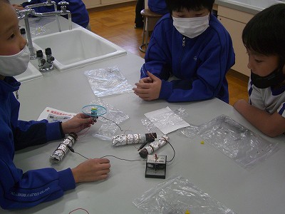 電池の学習を思いだして、直列につないだり、電流を調べたりしました。