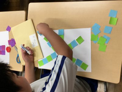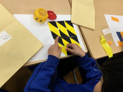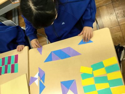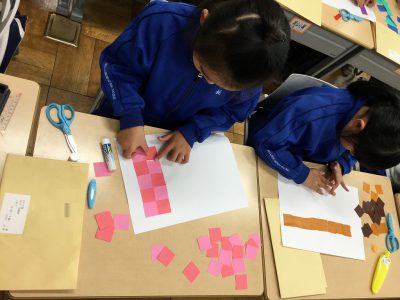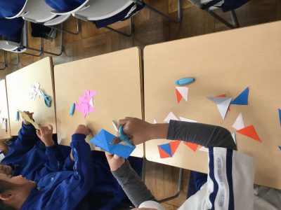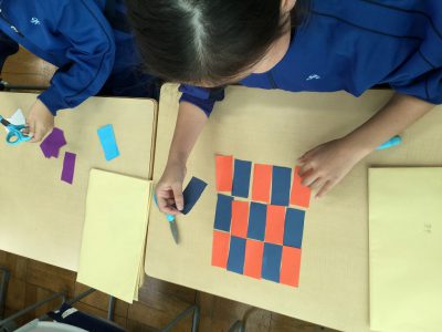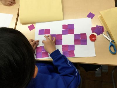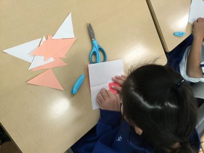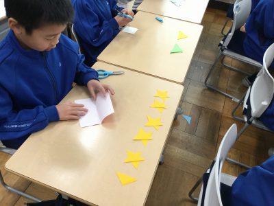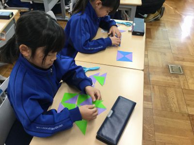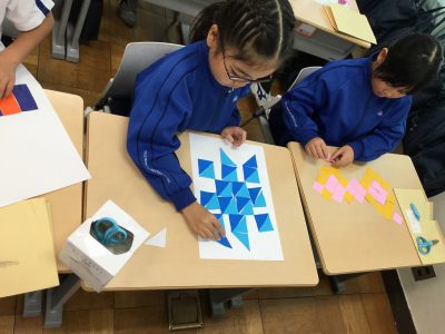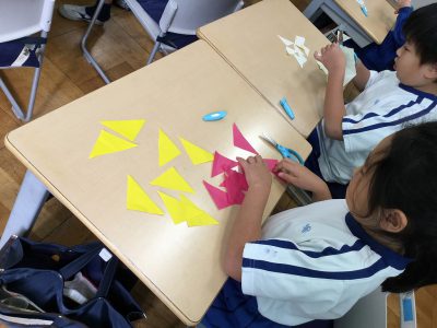 折り紙は、“正方形”であることをもとに、そこから「直角三角形」「長方形」「正方形」を切り分け、“もようづくり”に挑戦しています。