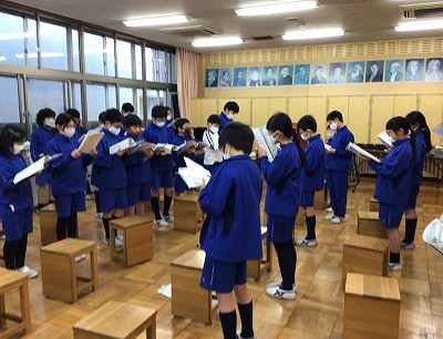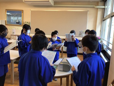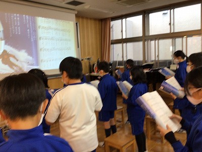 「♪スキーの歌」を発声練習のつもりで歌唱するところから、音楽の時間のスタートです。