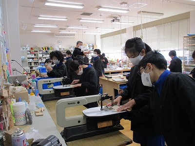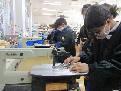 図工の時間は、手動と電動の糸鋸を使って、板を引いた線に切っています。お互いにサポートしながら、楽しく上手に切っている様子が見られました。