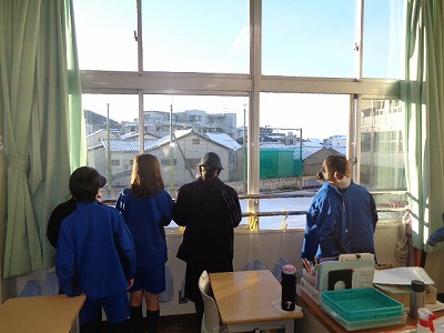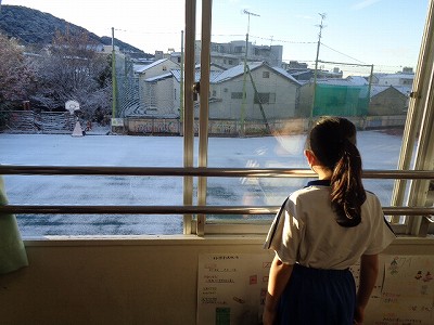 昨晩から雪が降り、今日は校庭も真っ白の朝を迎えました。「雪だ~!」と大はしゃぎで登校した4年生ですが、感染症対策のきまりで、学年毎に運動場の使用割り当てが決められており、残念ながら4年生は外に出て遊べませんでした。