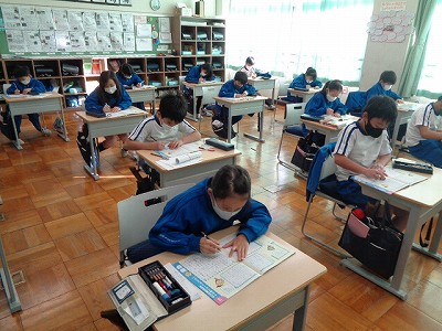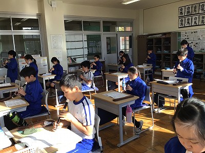 算数は、小数のかけ算とわり算の単元が終了し、今日からは「調べ方と整理の仕方」という単元に入ります。表をつかって書き写したり、正確に資料を読み取る集中力が必要です。資料を読み間違えないように、1つずつ確かめながら、問題を解いていきました。