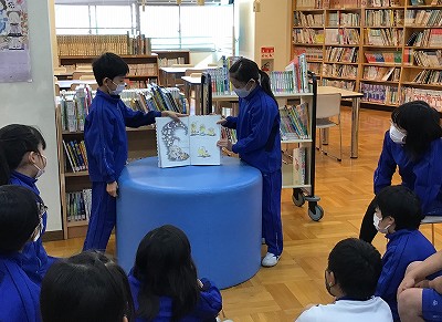5時間目は図書の時間です。読み聞かせ係さんが季節の絵本の読み聞かせをしてくれます。今日は「サンタクロースはおもちゃはかせ」というクリスマスの絵本を選んで読んでくれました。
