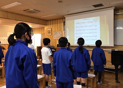リコーダー奏の楽譜を“レパートリー集”に貼っています。そこには、1学期に練習していた「♪心から心へ」が残っています。みんなの歌声を聞きたかったので、校歌と合わせて、歌唱するところから学習を始めました。