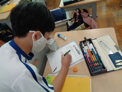 3年生の音楽の時間にも、久しぶりに“校歌”を歌いました。柔らかく明るい声で歌いましょう、と助言を加えました。伸びやかな声が音楽室に広がりました。