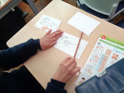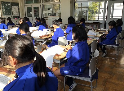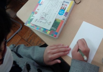 年賀状の清書です。前回の時間から下書きを少しずつ書いて完成させ、それをもとに、コンクール出品用と実際に送りたい相手に出す年賀状を書きました。