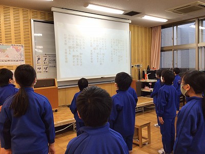 2学期最後のマラソンでした。1分で1周を目安に、5分の間に速い人で5~6周ほど走りました。寒い中ですが、走りこんで体があたたまりました。