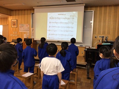 学期終わり・学期始めの式では“校歌”を歌っています。今年度は、オンラインでの礼拝・儀式を進めているので、全校での声合わせはできませんが、各学年で練習しています。