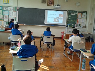 社会は、京都府南丹市美山町について学習しています。今日は、それぞれが調べた美山町旅行のプランを発表し合いました。「スキーもできるの?」「温泉もあるの?」など、それぞれの発表に驚きの連続です。美山町の魅力を知ることができた4年生。来週はまとめを行います。