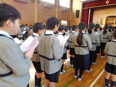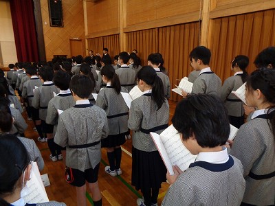 朝の礼拝後、2月の聖日参拝に向けた全校練習がありました。