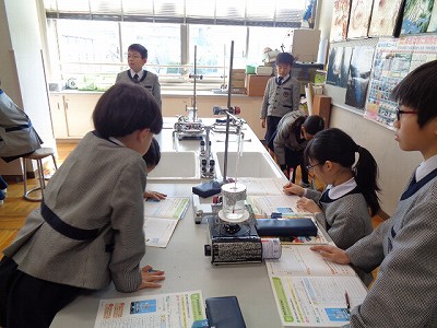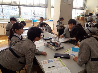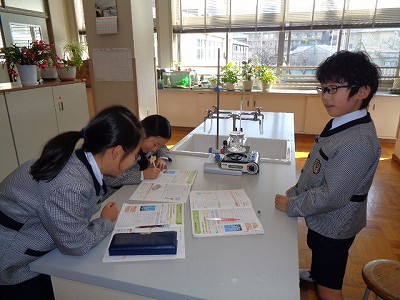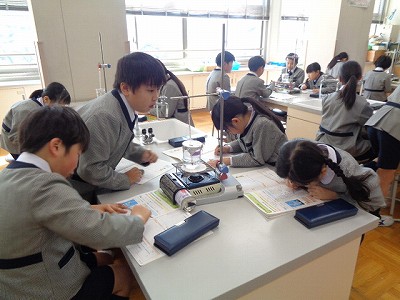 理科授業は「温度と水の変化」についての実験です。「沸騰」という言葉を頭でわかっていても、目の前でビーカーの中の水が沸騰する様子を確かめると、興奮気味でした。沸点は100度のはずですが、95度を超えると沸騰状態になることが分かりました。