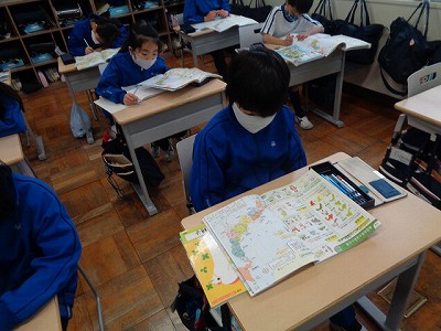 地図帳を使って、都道府県の学習をしました。都道府県の名前についている文字(山や島など)に注目して、あてはまる都道府県名をさがす問題に取り組みました。