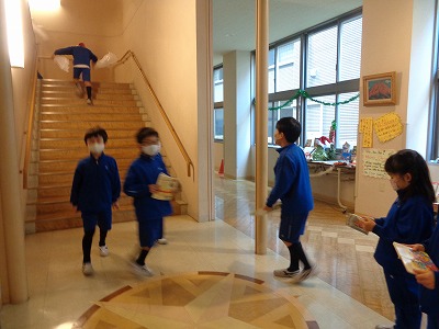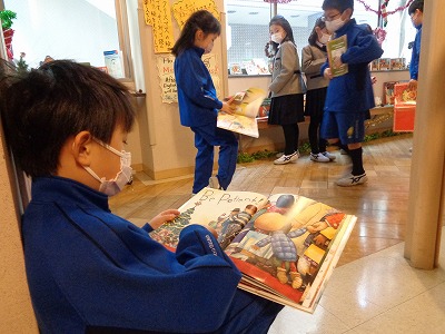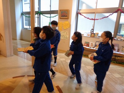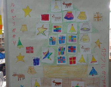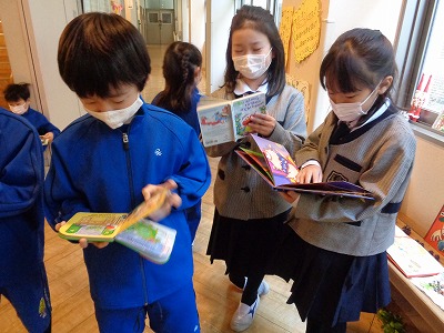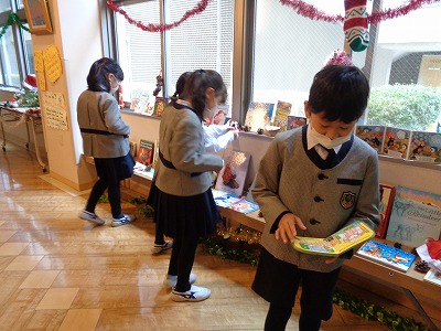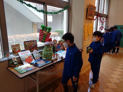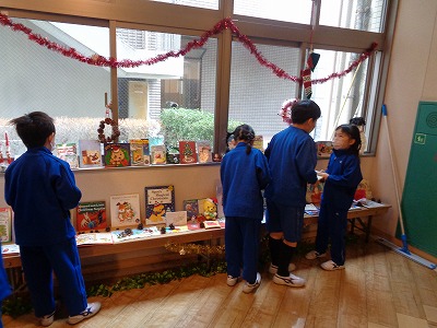 職員室前では、子ども達がクリスマス英語絵本を読んだり、デコレーションに触れたりして楽しんでいました。