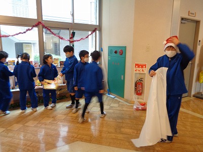 12/23木【2学期終業式・英語クリスマス絵本・サンタ☆クリーン現る!・保健室・お雑煮】