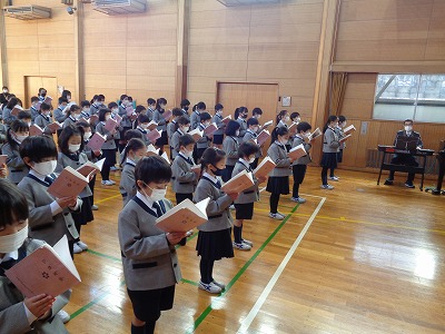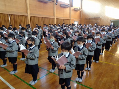 式の締めくくりに「明るく・正しく・仲良く」の気持ちを込めて、校歌斉唱しました。
