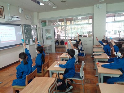 二つのテーマについて、自分の意見を4色カードを使って表し、考えを発表したり、他学年の人の意見を聞きました。