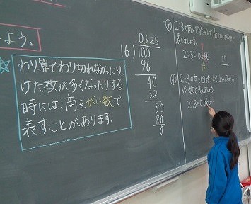 1時間目は算数です。今日は小数のわり算を生かして「商をがい数で求める」という計算を行いました。習ったばかりのがい数の知識を利用して、位に気をつけながら問題を解きます。