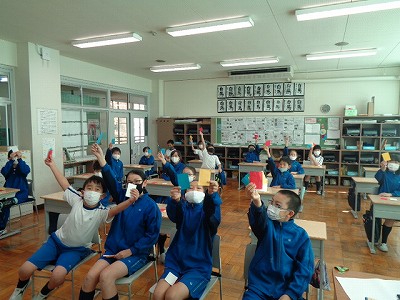 パソコンのカメラに向かって、4色カードを使用しながら、学校全体での問題について考えます。4年生は、密をさけることや、チャイムが鳴ってからのおしゃべりをなくすため、5分前行動やよびかけを頑張っていることを、画面を通して全校へ、うまく伝えることができました。