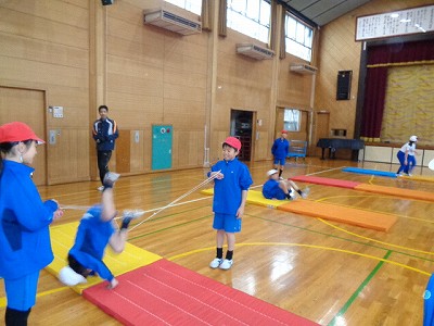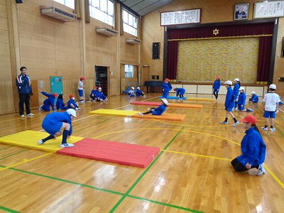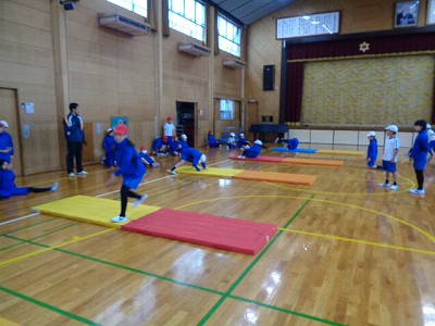 体育授業では、マット運動に取り組んでいるので、雨の心配はありません。側転や後転、開脚前転など、様々の技を練習しています。授業の最後に、それぞれが自分の得意技を披露しました。(動きが速くて、うまく写真がとれませんでした)