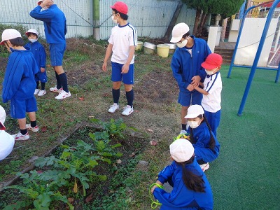 学習園に班長さんと種を蒔いた大根が大きく成長しました。昨日の朝根っこマラソンの後に、様子を見に行き、班長さんと一緒に大根の成長を見れるときがありました。