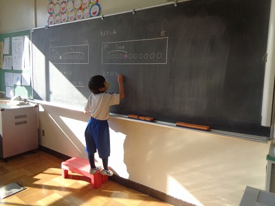 「ものと人の数」の学習のまとめとして、発展問題に取り組みました。右から〇番目、左から〇番目、など問題文から図を書いて、式・答えを考えました。
