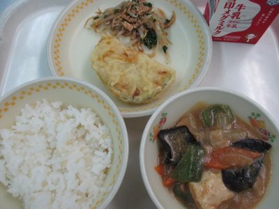 最後に片栗粉でとじたので、みそが食材にしっかり絡まっておいしくできます。今日は2種類のみそを味わえる献立でした。