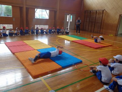 見ている人は、お友達の技の組み合わせ方や、転がる方向の工夫をたくさん見つけることができました。