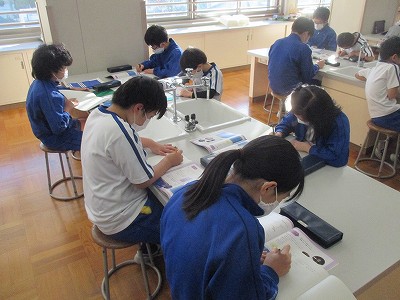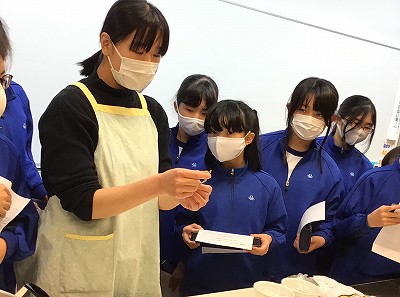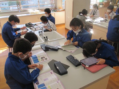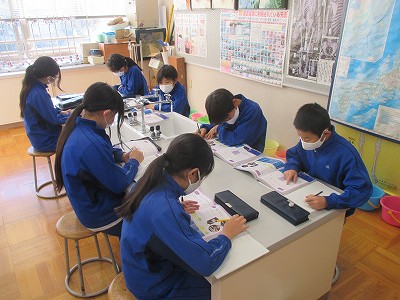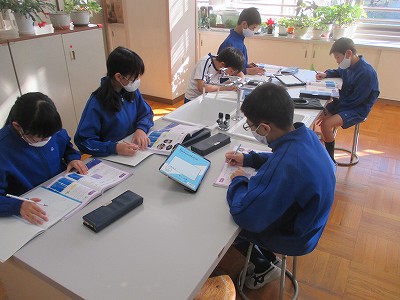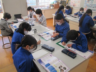 「ご飯とみそ汁」の調理実習(エアですが…)を前に、“出汁(だし)”に注目する活動を行いました。教室で3種類の出汁(こんぶ・煮干し・かつおぶし)の取り方について、教科書をもとに学習した後、家庭科室に向かいました。