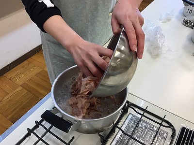 その横で“湯を沸騰させておいた鍋”があります。みんなは、その目的をきっちりと理解していました。それは、ボウルいっぱいのかつおぶしで出汁を取る鍋です。すぐに、香ばしい香りが室内に広がりました。「わあ~いい香り~」と、歓声が上がりました。
