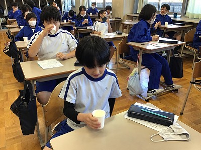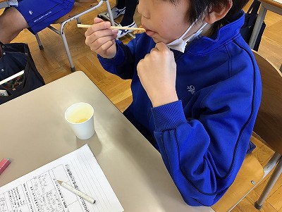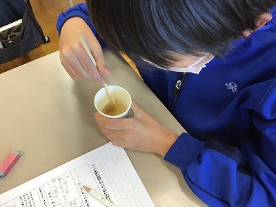 いよいよ“試飲”の時間です。マスクを外すため、学習場所を教室に移動し、こんぶ⇒煮干し⇒かつおぶしの順に、味わっていきました。