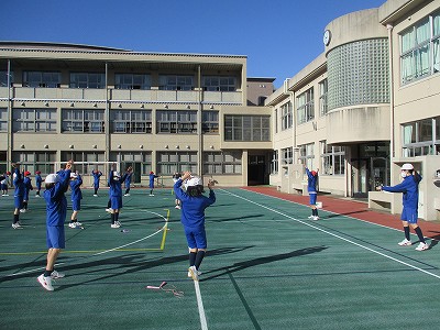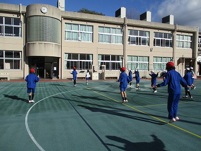 体育の時間。今日も準備体操の後縄跳びをしました。前跳び、後ろ跳び、駆け足跳び、交差跳び、あや跳び、二重跳びをインターバルを取りながら次々に跳びました。