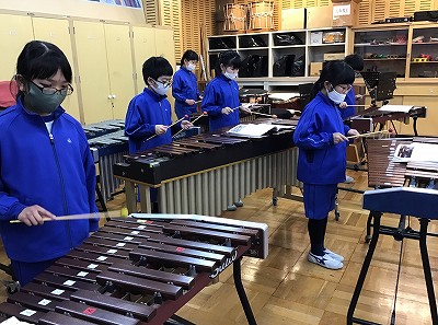 マスクを外せないので、音楽室では“エア”練習をします。