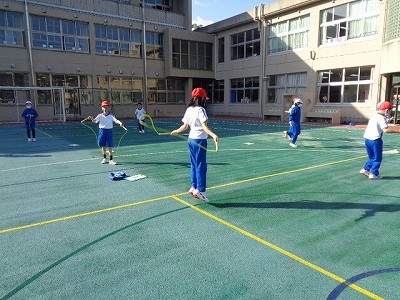 なわ跳びは、前回し30秒跳びや、後ろ回し30秒跳びをしました。前回しは、最高90回、後ろ回しは最高80回など、できるだけたくさん速く跳ぶことをめあてにしています。各自で、いろいろな跳び方の記録も更新中です。
