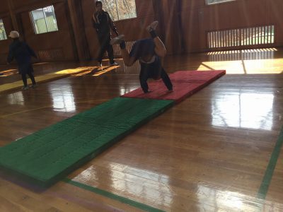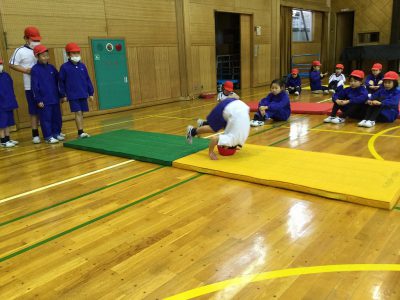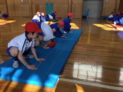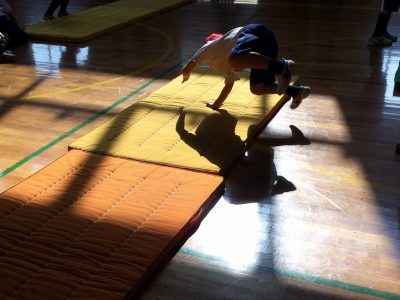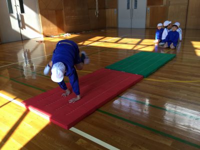 1/25木【マットあそび】 お知らせ 2018/01/25 体育の時間は、マットあそびに取り組んでいます。 前転では、手の付き方や回るスピード、連続回転を課題に活動しています。 2枚のマットの上を“3回転”にチャレンジ!と、回る工夫を考えています。 また、こんな動きも… “かえる立ち”を練習した後は、“川跳び”に挑戦です。 マットの川に足が触れたらアウト!。 始めは少々ぎこちない動きでしたが、跳ね方が分かると、両手をついてピョンピョンと進むことができました。 見ているこちらは、頭から落ちないか、どきどきしました… ←前の記事 お知らせの一覧 次の記事→ 文教トピックス 学年だより1年 学年だより2年 学年だより3年 学年だより4年 学年だより5年 学年だより6年 一覧はコチラ カテゴリー 文教トピックス (200) 文教トピックス (5) 学年だより1年 (160) 学年だより1年 (3) 学年だより2年 (3) 学年だより2年 (160) 学年だより3年 (3) 学年だより4年 (3) 学年だより5年 (3) 学年だより6年 (3) 文教小ニュース (4,428) お知らせ (1,004) イベント (12) 入試関連 (13) 2024年度 (1,063) 文教トピックス (198) 学年だより1年 (172) 学年だより2年 (170) 学年だより3年 (171) 学年だより4年 (177) 学年だより5年 (175) 2023年度 (878) 文教トピックス (204) 学年だより1年 (165) 学年だより2年 (167) 学年だより3年 (169) 学年だより4年 (173) 2022年度 (738) 文教トピックス (216) 学年だより1年 (174) 学年だより2年 (174) 学年だより3年 (174) 2021年度 (571) 文教トピックス (217) 学年だより1年 (177) 学年だより2年 (177) 2020年度 (455) 文教トピックス (249) 学年だより1年 (206)