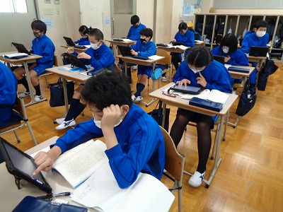 習熟クラスは「正負の数の表し方」「絶対値」「数の大小」などの練習問題を終え、確かめの補充問題に取り組みました。続いて、正負の数の加法、減法も進めることができました。