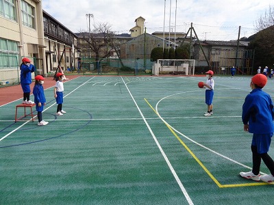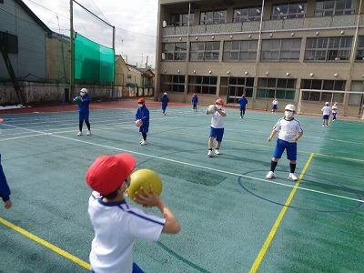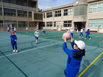 教室で学習の流れを説明した後、グラウンドに出て、チェストパスやドリブルの練習をしました。
