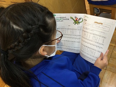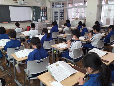 音楽室で「ドレミ」の階名を書き込んだ後は、教室に戻り、メロディをリコーダーで演奏する練習を行いました。