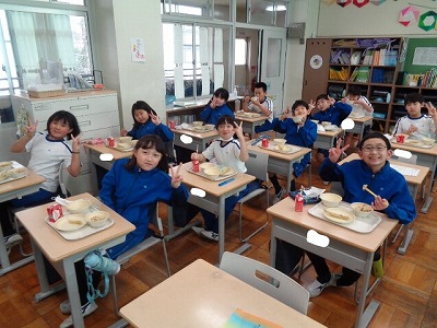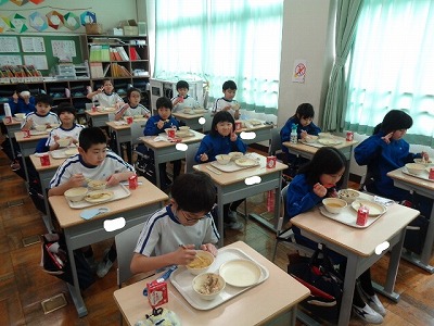普段味わえない献立に、3年生はわくわくしながら食べています。
