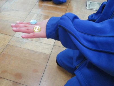 いろいろな遊び方がありますが、今日は手のひらの中にあるおはじきを手の甲にのせる遊びにチャレンジしました。