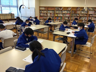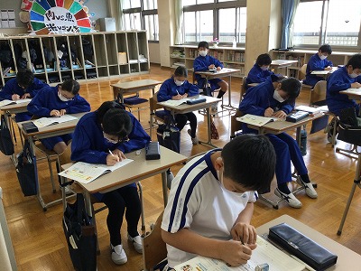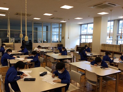 4時間目の国語は、図書室に移動し、漢検の模擬練習を行いました。先週は、点を落とした人が多く、空気がよどんだように重かったのですが、個人練習、日々の熟語宿題、朝根っこでの練習が“効いた”のか、軒並み点数が上がっていました。満点合格の人もいて、意気揚々の滑り出しでした。
