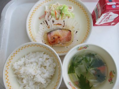 今日の献立は「鮭のマヨネーズ焼き、米粉スパゲティサラダ、白菜のスープ」でした。