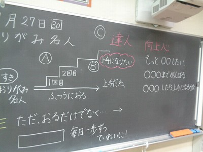 「おり紙名人」のお話をもとに『努力すること』について考える時間を設定しました。まずは、一人ひとりが頑張っていることを挙げ、それらの名人になるために、どんなことが必要かを考えました。