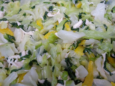 ☆ チンゲン菜、パプリカ、キャベツ、鶏のささみ肉を合わせた和え物です。