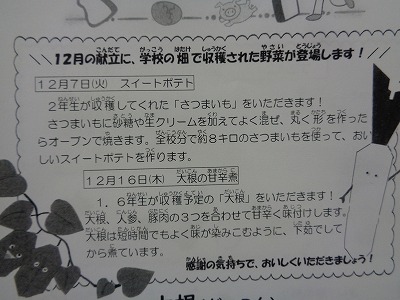 12月スクールランチ通信にも、今日のスイートポテトの記事を載せていますので、ご覧くださいね。